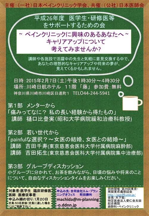 この度、医学生の皆さん・研修医の先生方に向けた講演を、とのお話を頂くにあたって若輩の身で一体何を話せることがあるのだろうかと非常に悩みました。けれどまずは、麻酔科専攻の中のペインクリニックという領域に関して「何をしているかよく分からない、馴染みのない分野」から「少しは聞いたことがある分野」になってもらえたらという思いでお話をさせて頂きました。